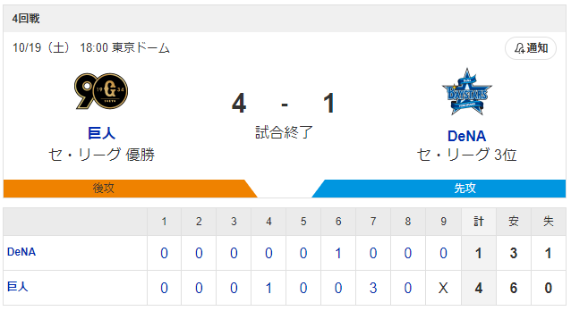 横浜DeNAベイスターズ(3位) vs 読売ジャイアンツ[巨人](1位)
