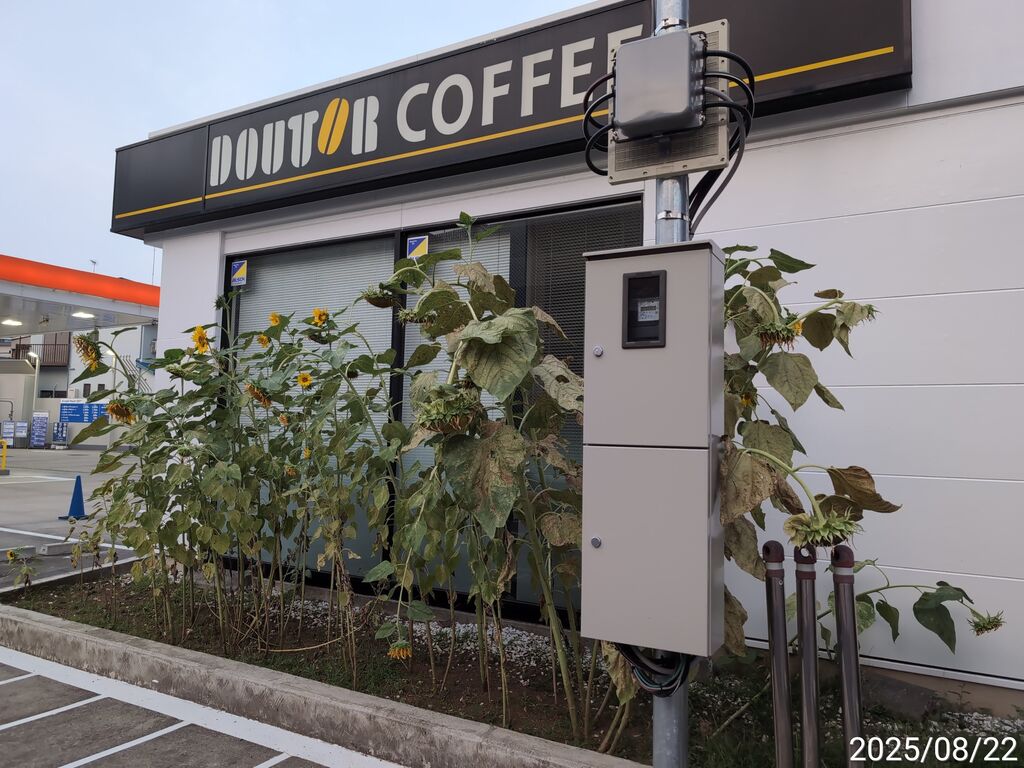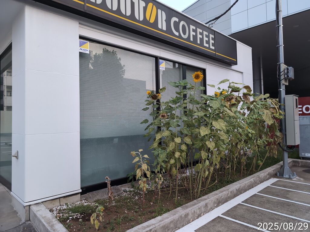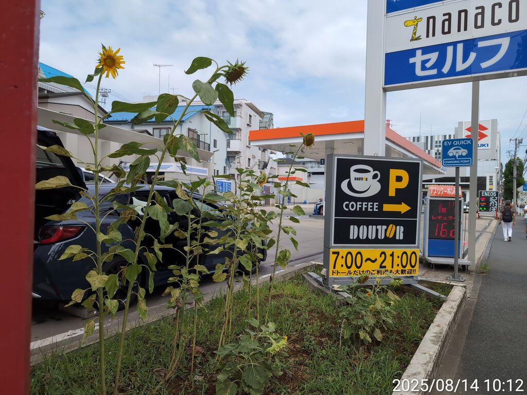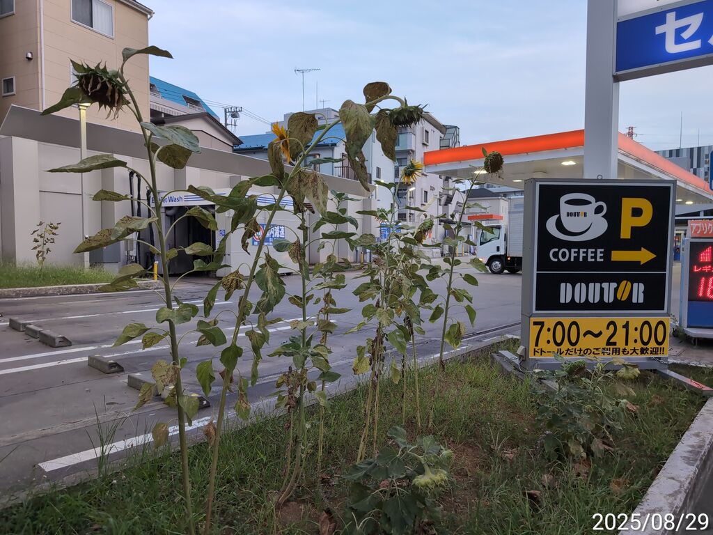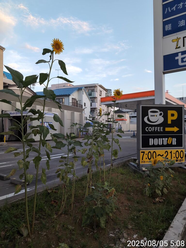 ガソリンスタンド側と孤高のひまわり