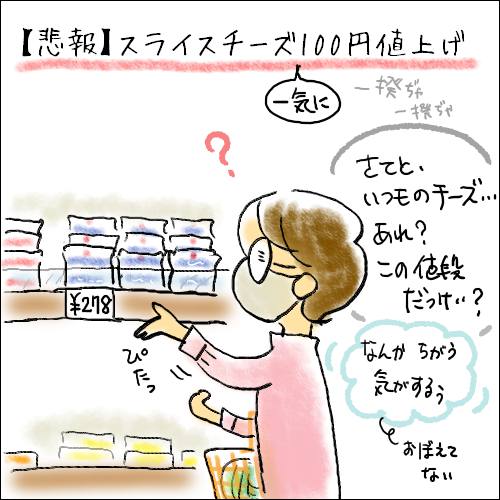 いつものスライスチーズを買おうとしたが「なんかいつもの値段と違う気がする」で思いとどまった。